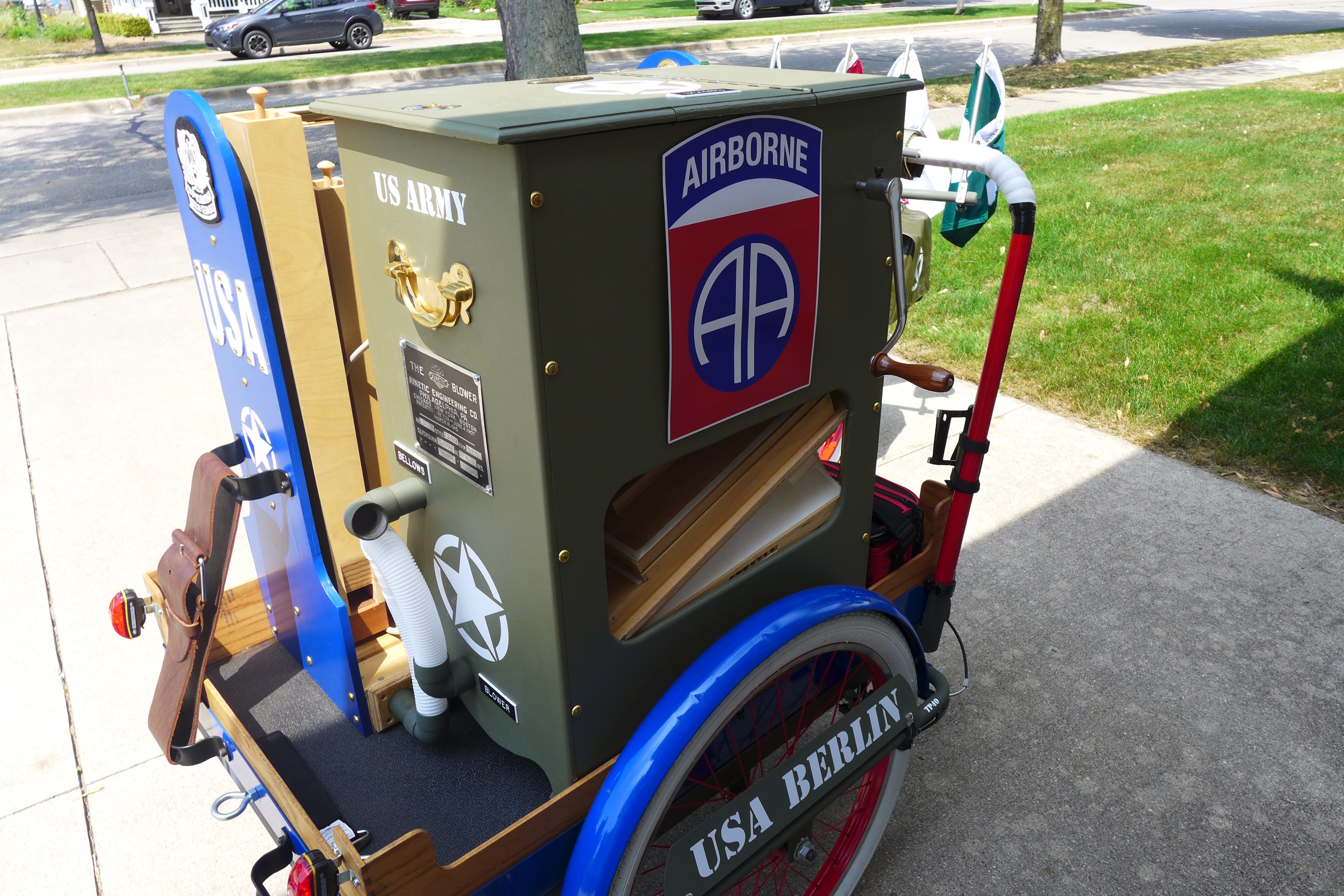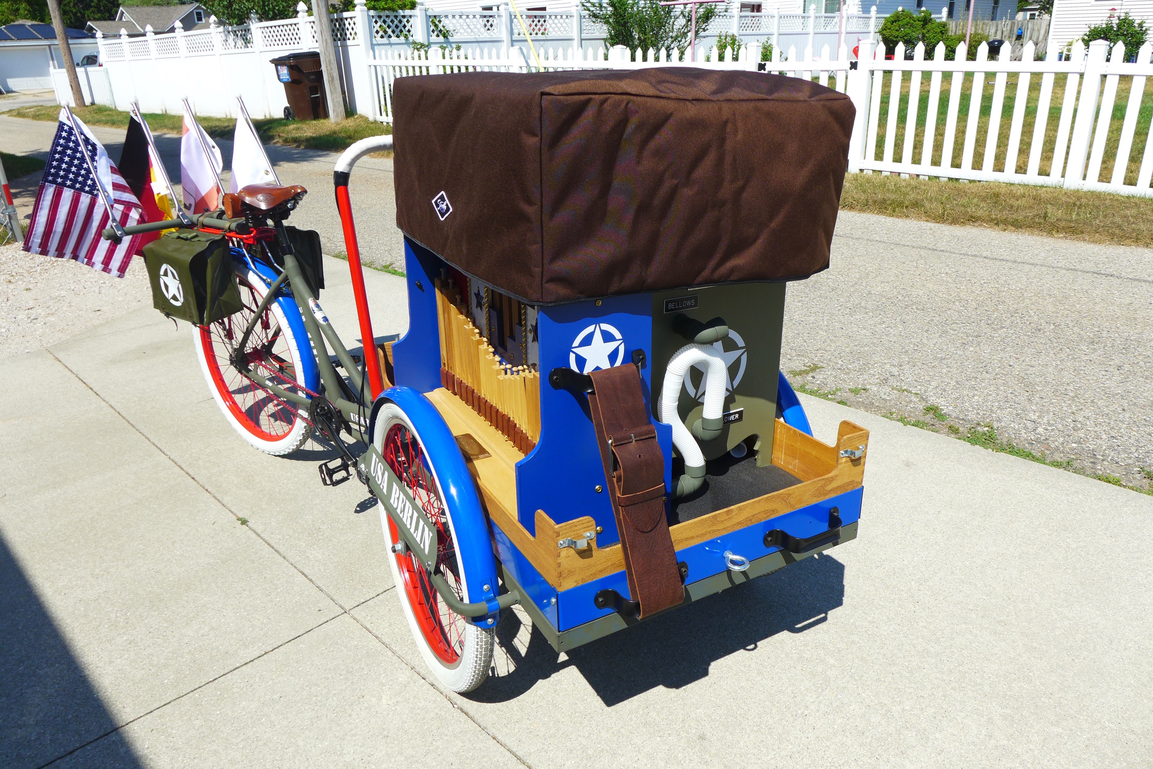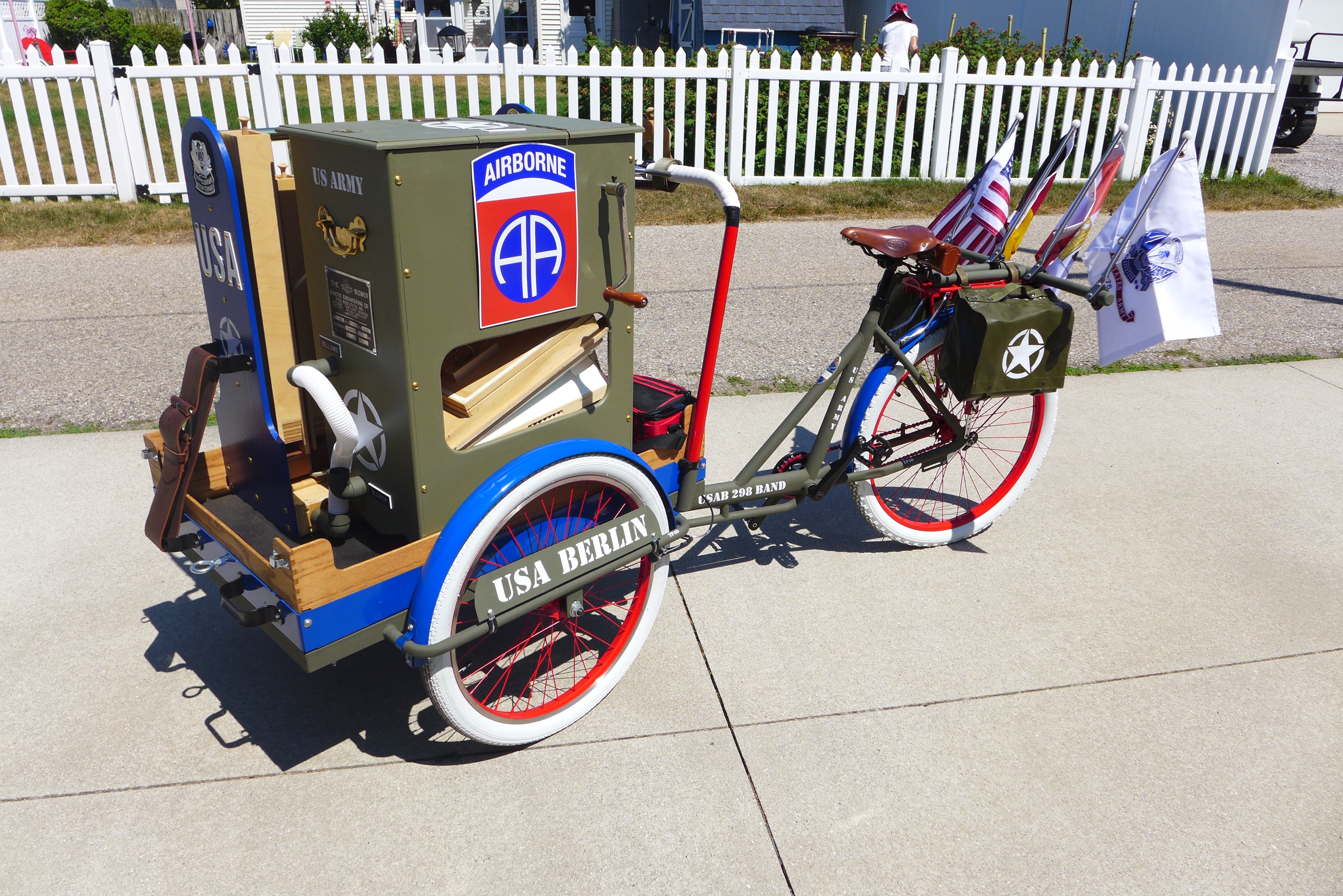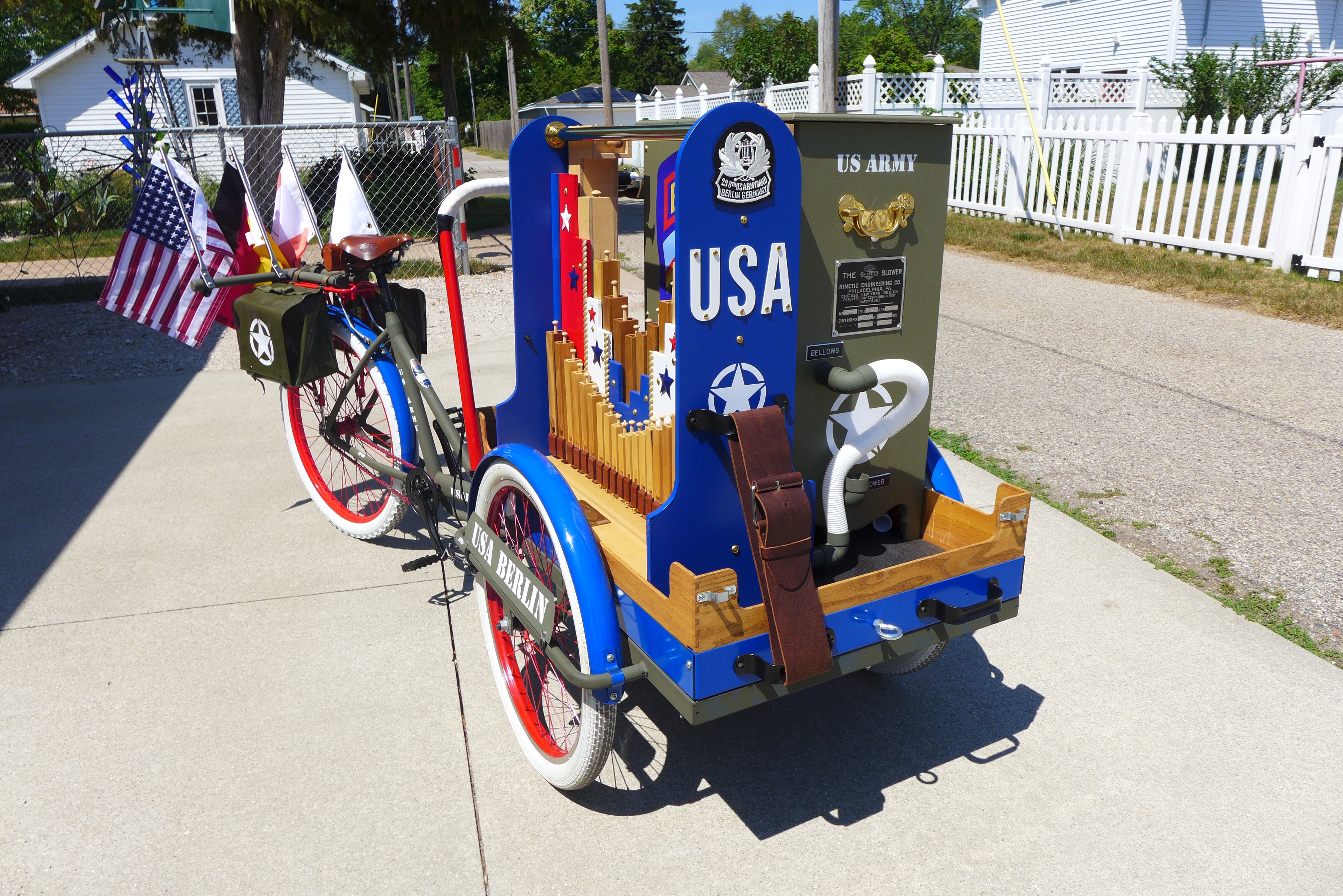 This Mobile Parade Unit (MPU) consists of a replica Schwinn Trike fitted with a replica Wurlitzer Parade Pipe Organ. The trike is Classic Americana custom painted red, white and blue. Trike is further outfitted with military parade regalia, military panniers, 4x period flags to include US Army, Berlin Bear Crest, USA, and Germany. The leather saddle with matching bag is Classic British Brooks. White tires are new Duros. The 3” leather tie down belts are also from England. The trike is single speed with a rear pedal brake and dual front parking brakes. Parade Pipe Organ is a replica Wurlitzer with 31 wood flutes. There are two sources for wind supply, a hand cranked bellows, and a 12v blower. Music controller is an updated MIDI player that uses SD card memory to hold MIDI files. Tunes can be played custom sequenced, as selected, or continuously looped. The organ scale is the standard 31-note as used in modern street organs.