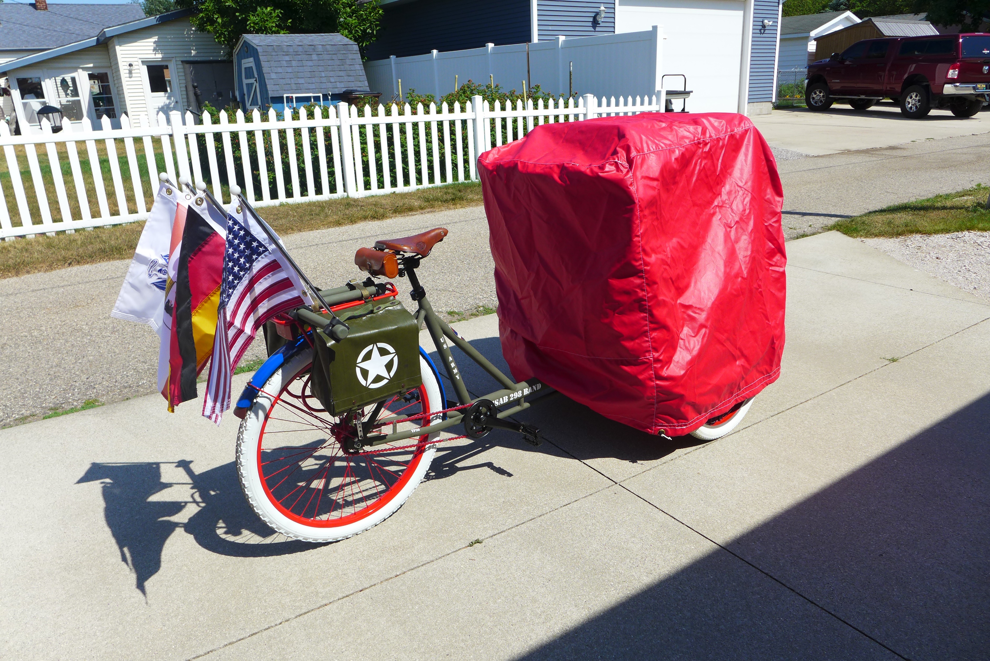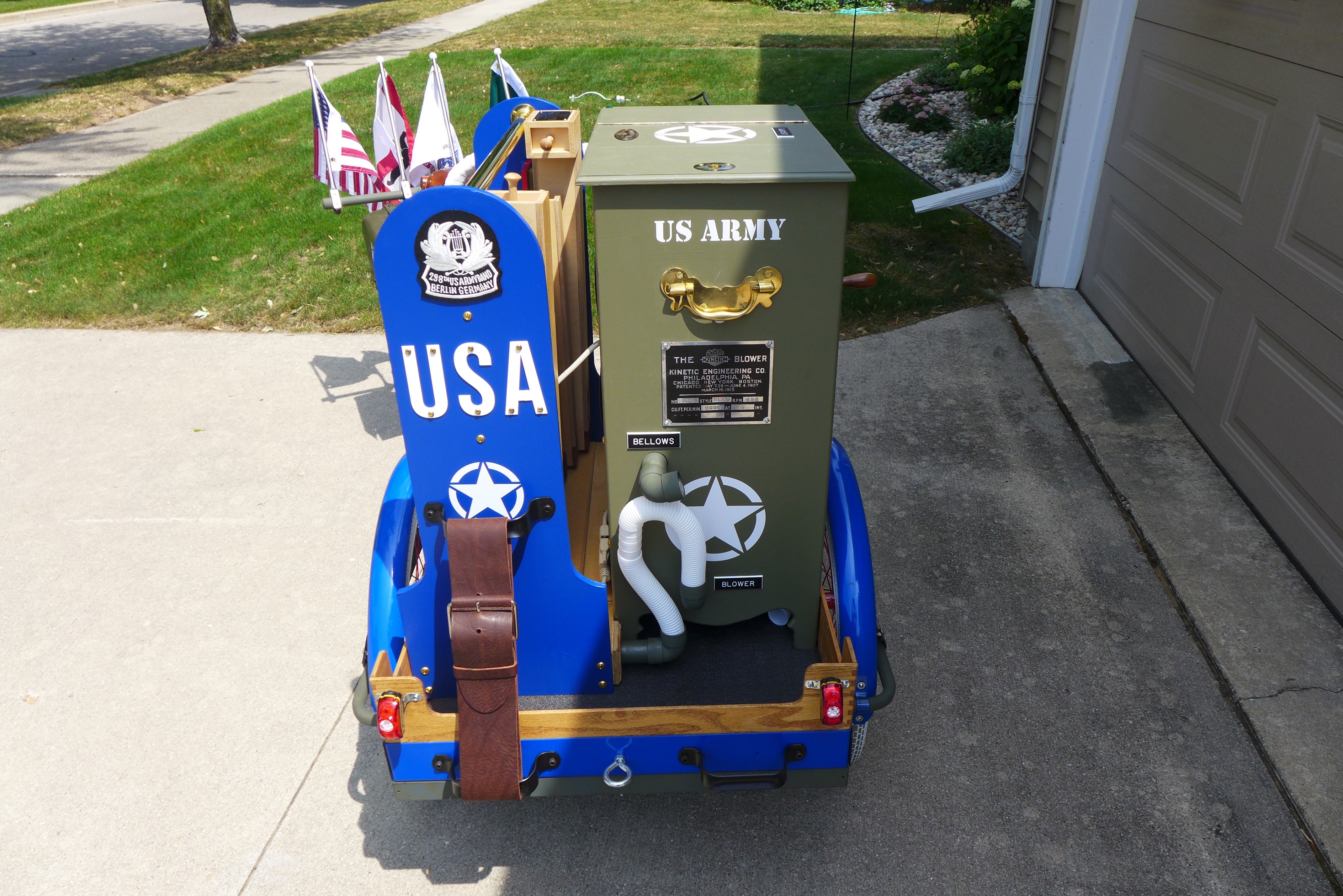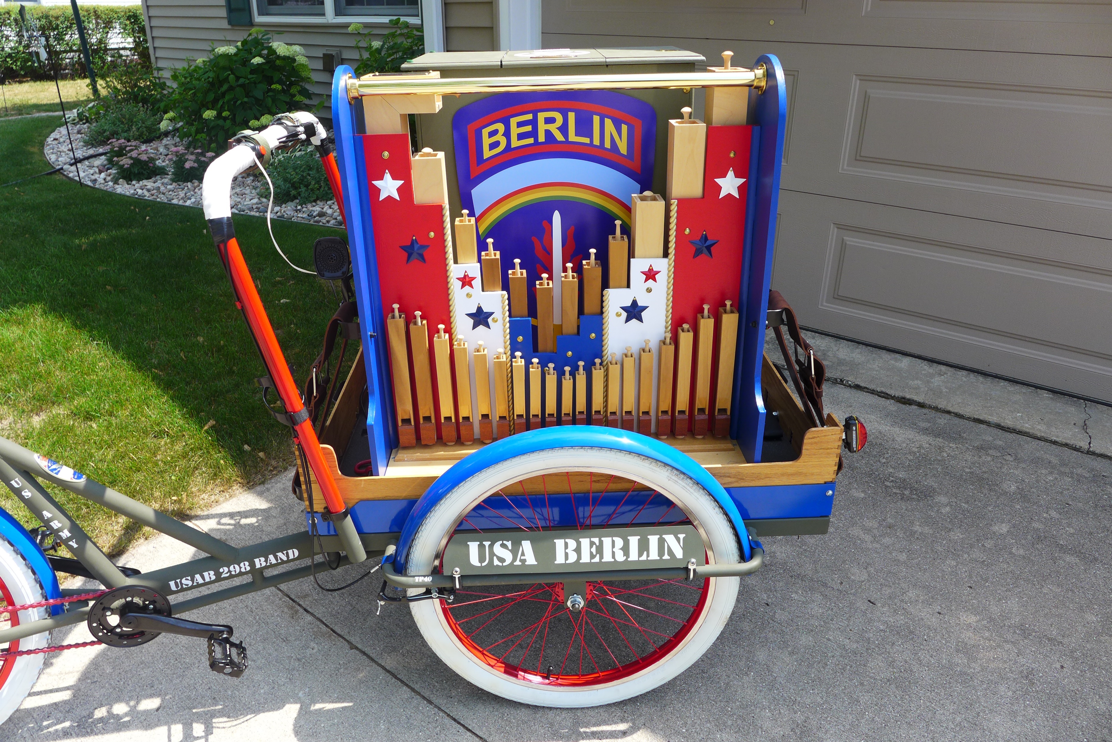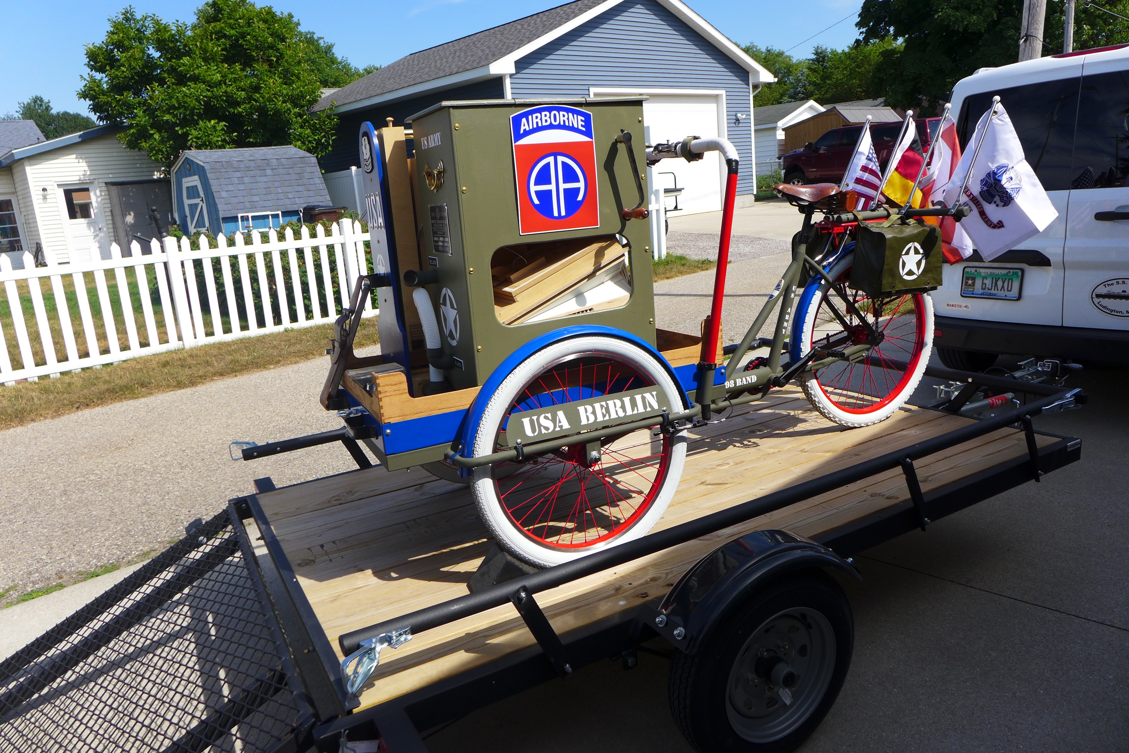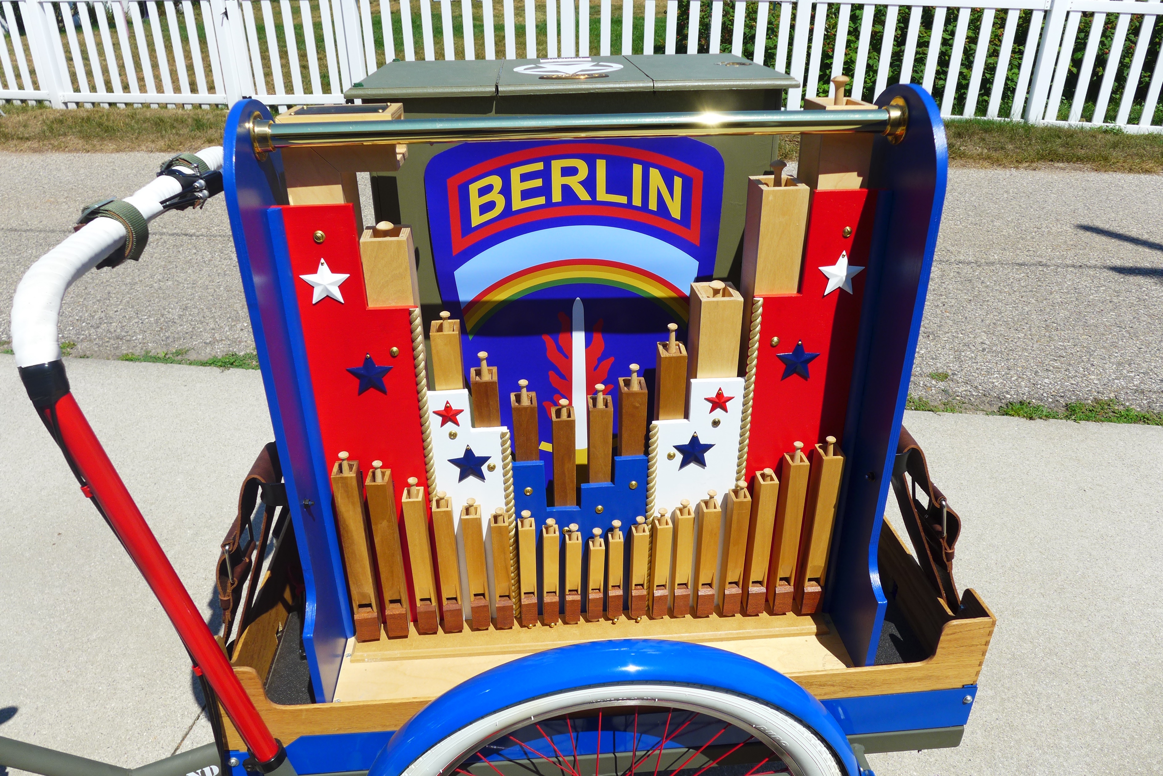 This Mobile Parade Unit (MPU) consists of a replica Schwinn Trike fitted with a replica Wurlitzer Parade Pipe Organ. The trike is Classic Americana custom painted red, white and blue. Trike is further outfitted with military parade regalia, military panniers, 4x period flags to include US Army, Berlin Bear Crest, USA, and Germany. The leather saddle with matching bag is Classic British Brooks. White tires are new Duros. The 3” leather tie down belts are also from England. The trike is single speed with a rear pedal brake and dual front parking brakes. Parade Pipe Organ is a replica Wurlitzer with 31 wood flutes. There are two sources for wind supply, a hand cranked bellows, and a 12v blower. Music controller is an updated MIDI player that uses SD card memory to hold MIDI files. Tunes can be played custom sequenced, as selected, or continuously looped. The organ scale is the standard 31-note as used in modern street organs.