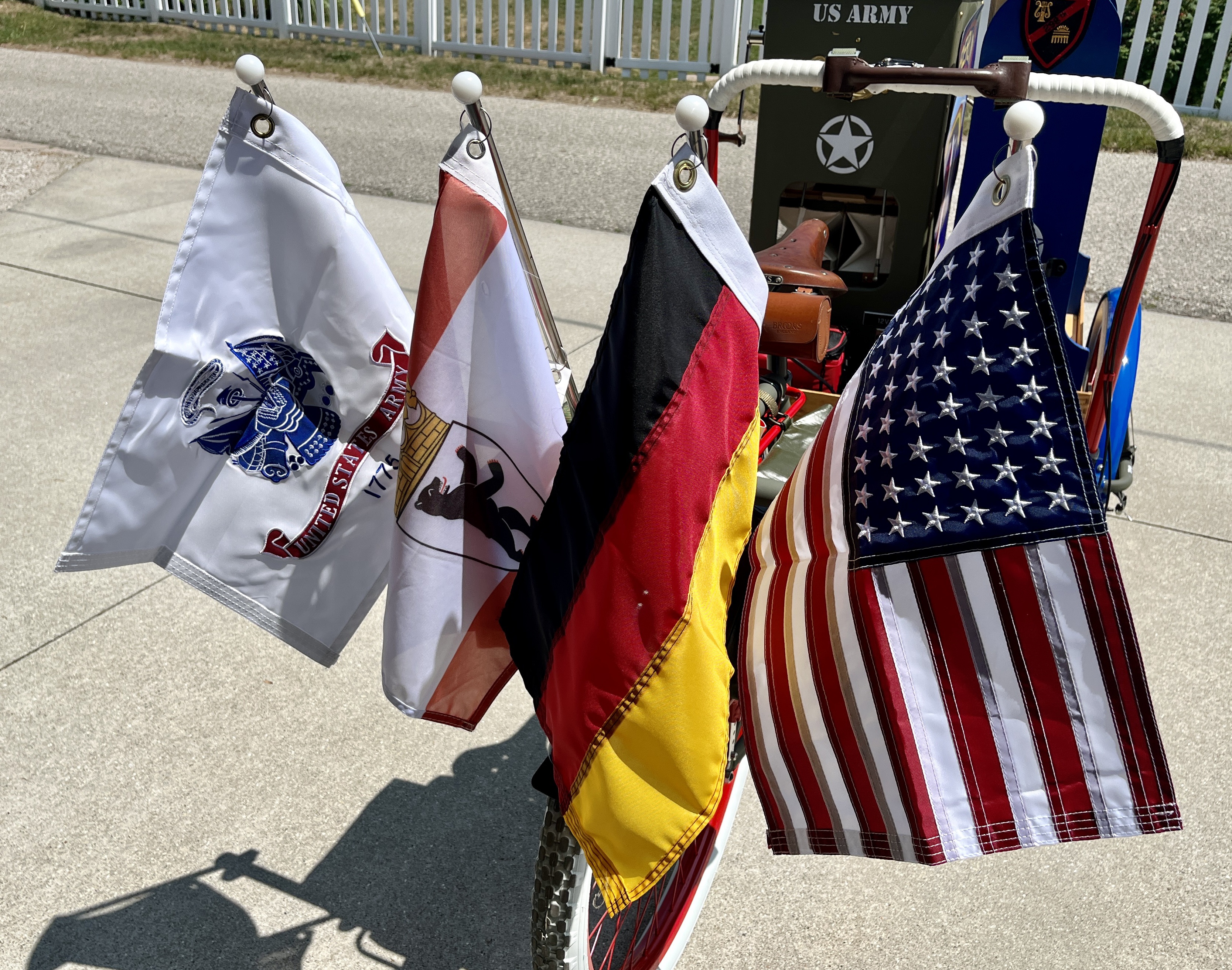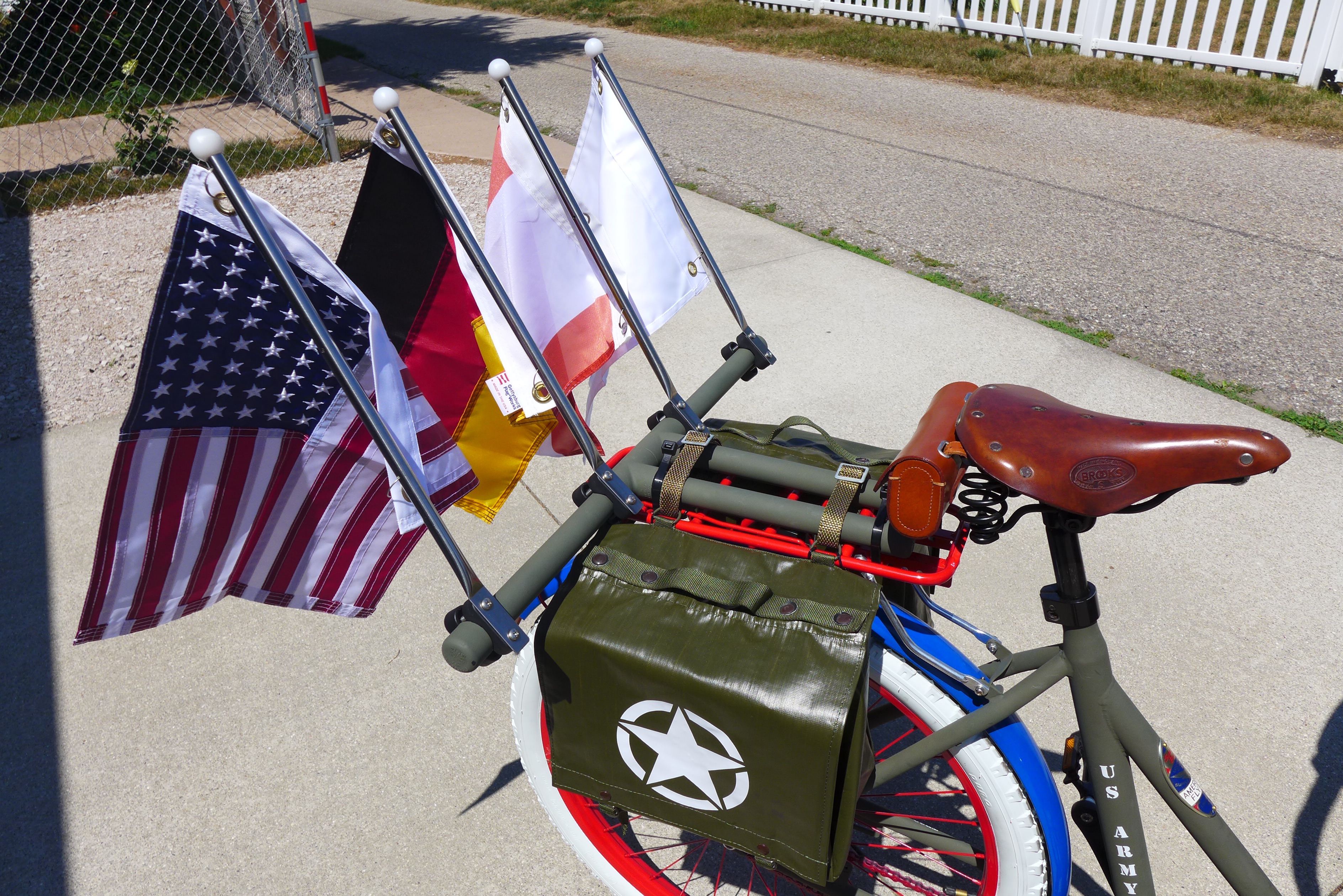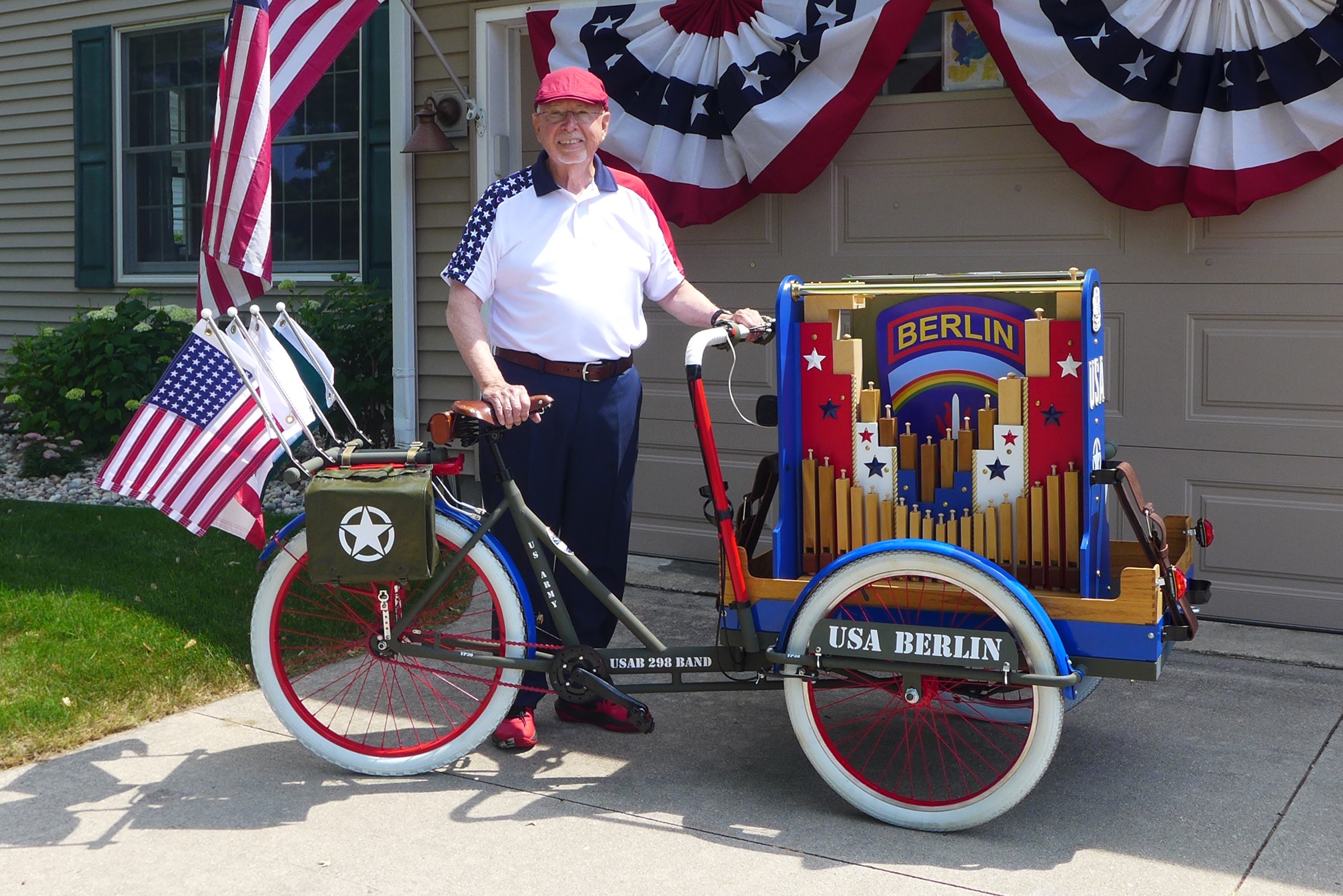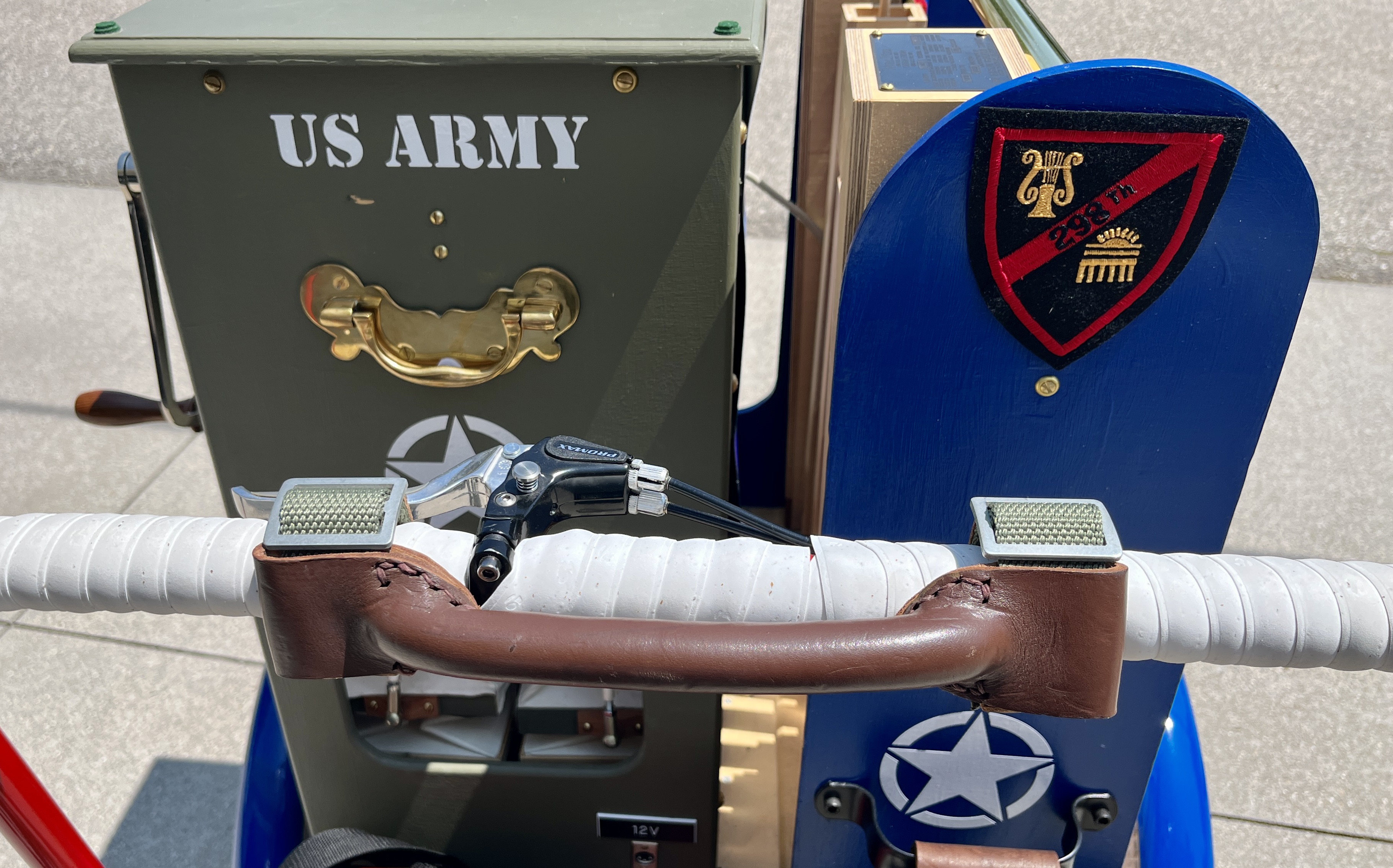 This Mobile Parade Unit (MPU) consists of a replica Schwinn Trike fitted with a replica Wurlitzer Parade Pipe Organ. The trike is Classic Americana custom painted red, white and blue. Trike is further outfitted with military parade regalia, military panniers, 4x period flags to include US Army, Berlin Bear Crest, USA, and Germany. The leather saddle with matching bag is Classic British Brooks. White tires are new Duros. The 3” leather tie down belts are also from England. The trike is single speed with a rear pedal brake and dual front parking brakes. Parade Pipe Organ is a replica Wurlitzer with 31 wood flutes. There are two sources for wind supply, a hand cranked bellows, and a 12v blower. Music controller is an updated MIDI player that uses SD card memory to hold MIDI files. Tunes can be played custom sequenced, as selected, or continuously looped. The organ scale is the standard 31-note as used in modern street organs.