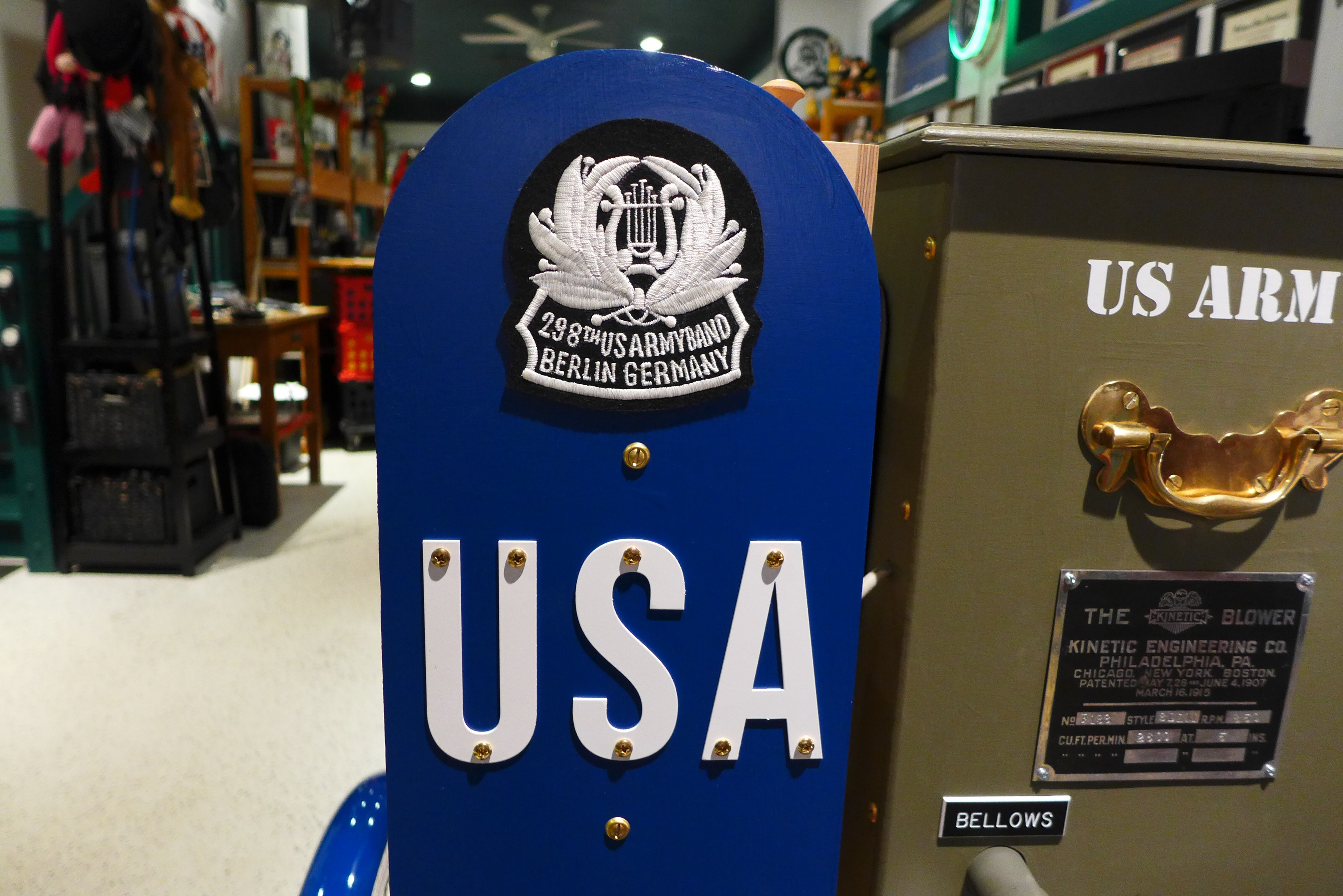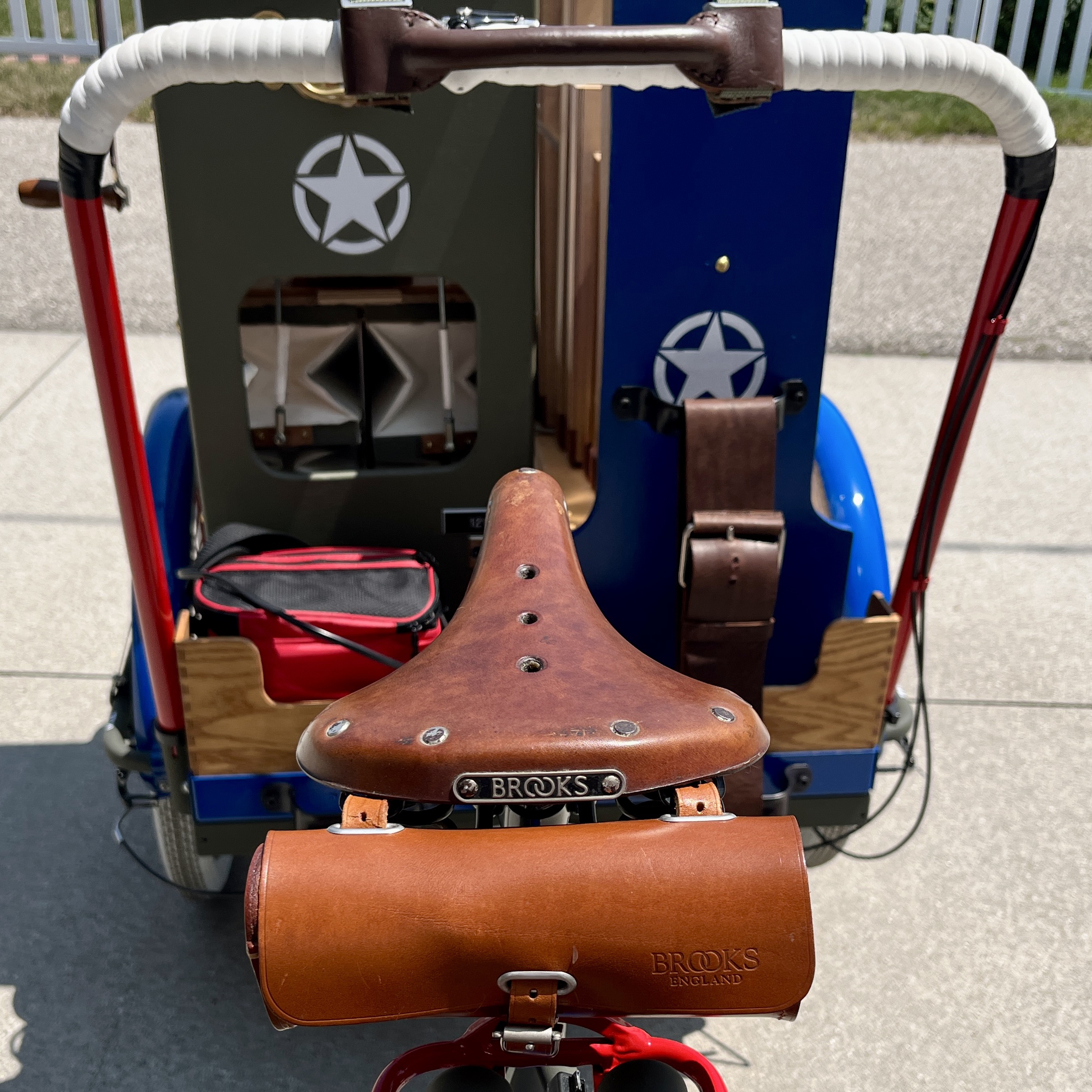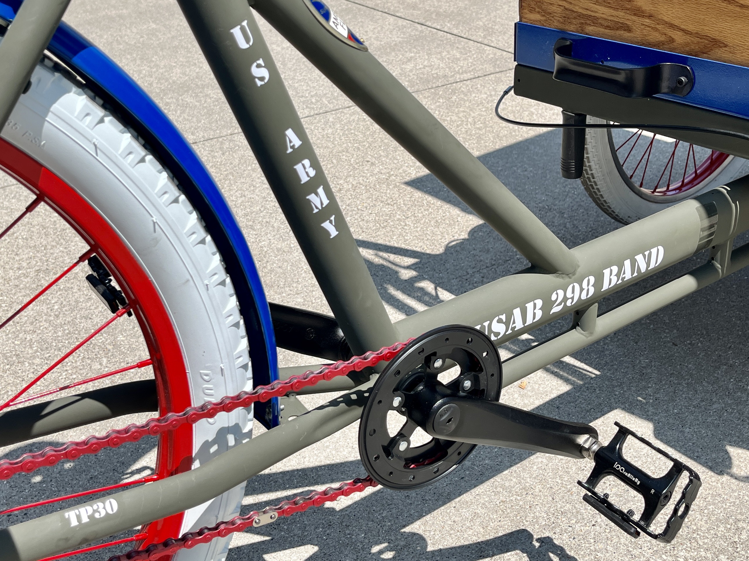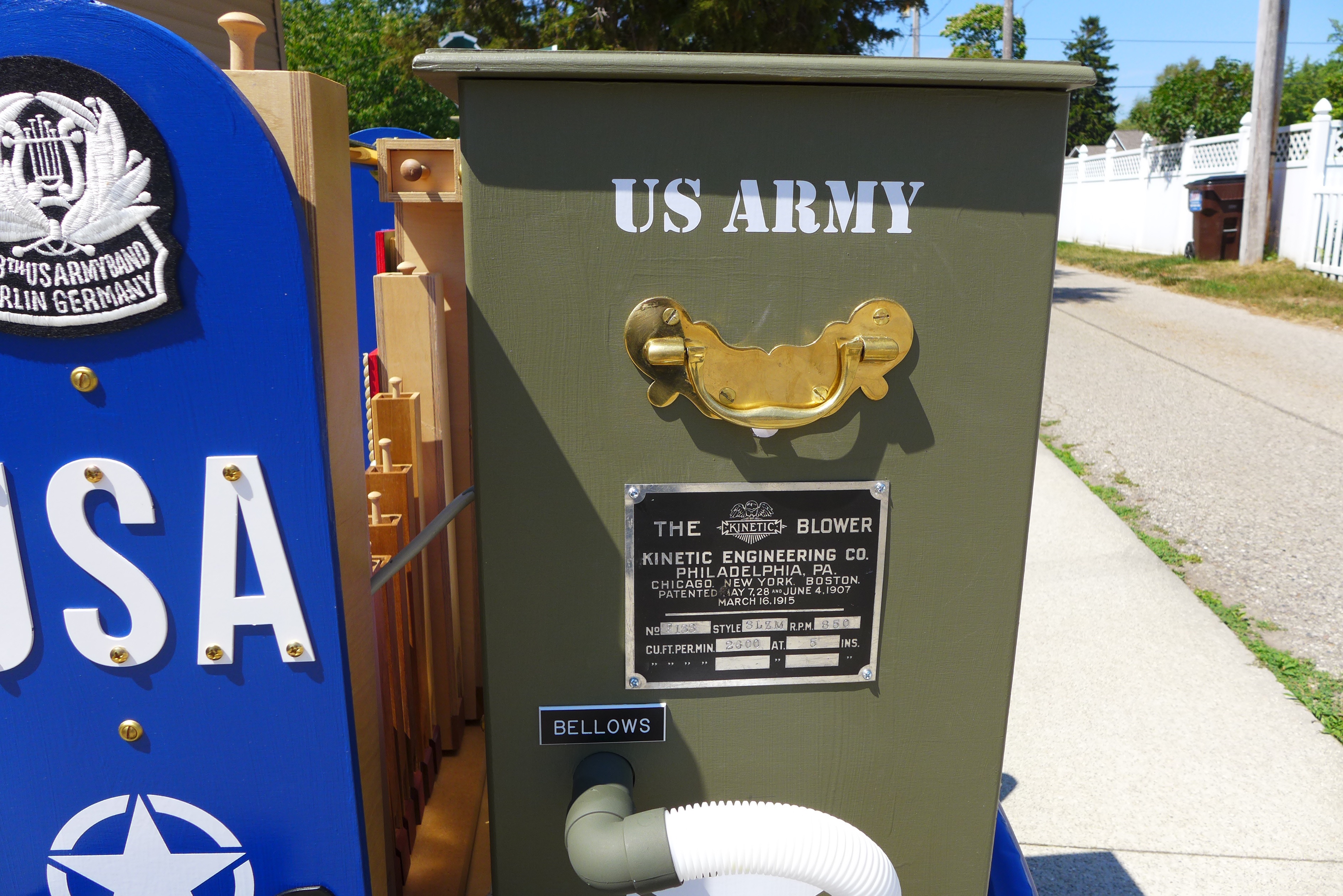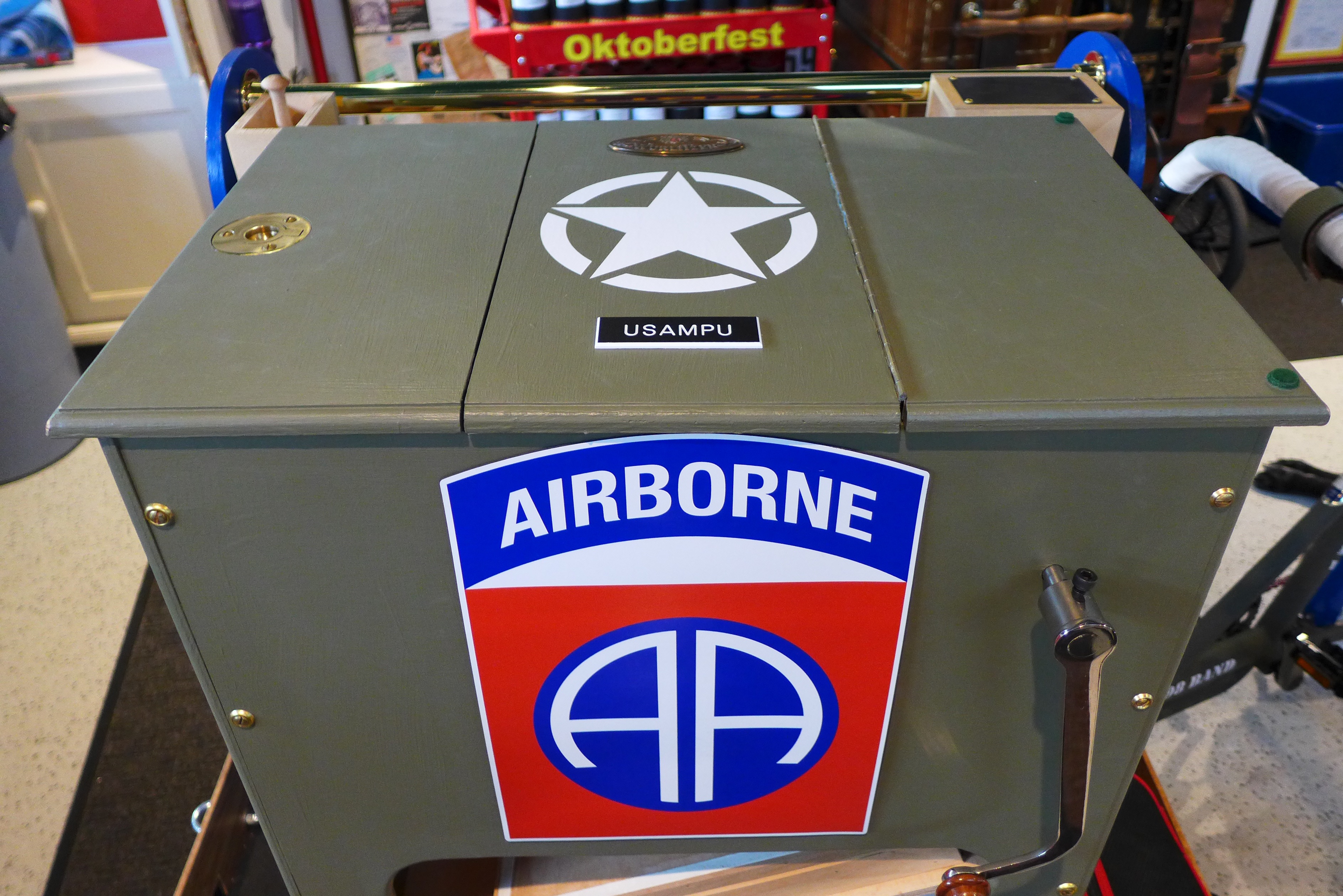 This Mobile Parade Unit (MPU) consists of a replica Schwinn Trike fitted with a replica Wurlitzer Parade Pipe Organ. The trike is Classic Americana custom painted red, white and blue. Trike is further outfitted with military parade regalia, military panniers, 4x period flags to include US Army, Berlin Bear Crest, USA, and Germany. The leather saddle with matching bag is Classic British Brooks. White tires are new Duros. The 3” leather tie down belts are also from England. The trike is single speed with a rear pedal brake and dual front parking brakes. Parade Pipe Organ is a replica Wurlitzer with 31 wood flutes. There are two sources for wind supply, a hand cranked bellows, and a 12v blower. Music controller is an updated MIDI player that uses SD card memory to hold MIDI files. Tunes can be played custom sequenced, as selected, or continuously looped. The organ scale is the standard 31-note as used in modern street organs.