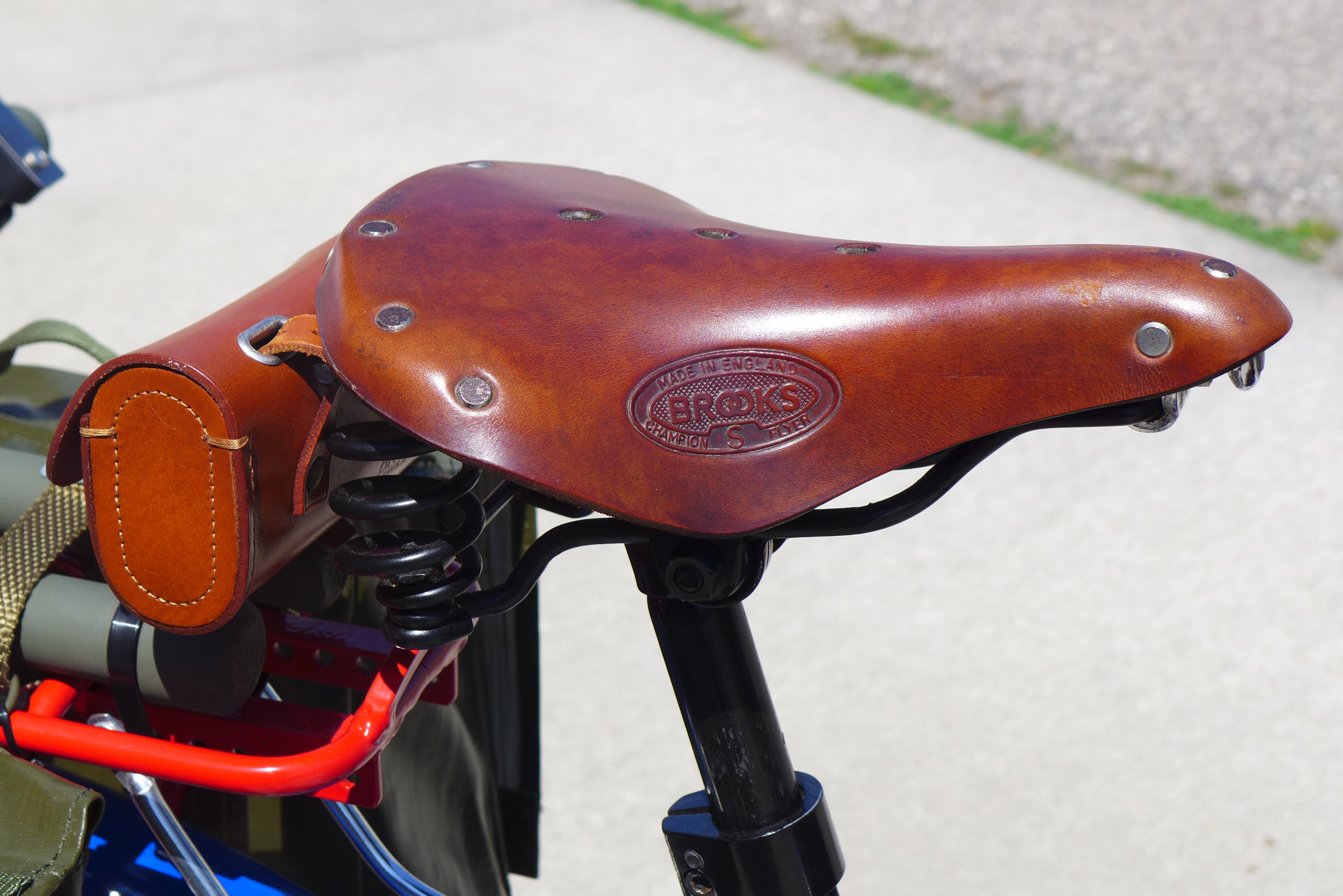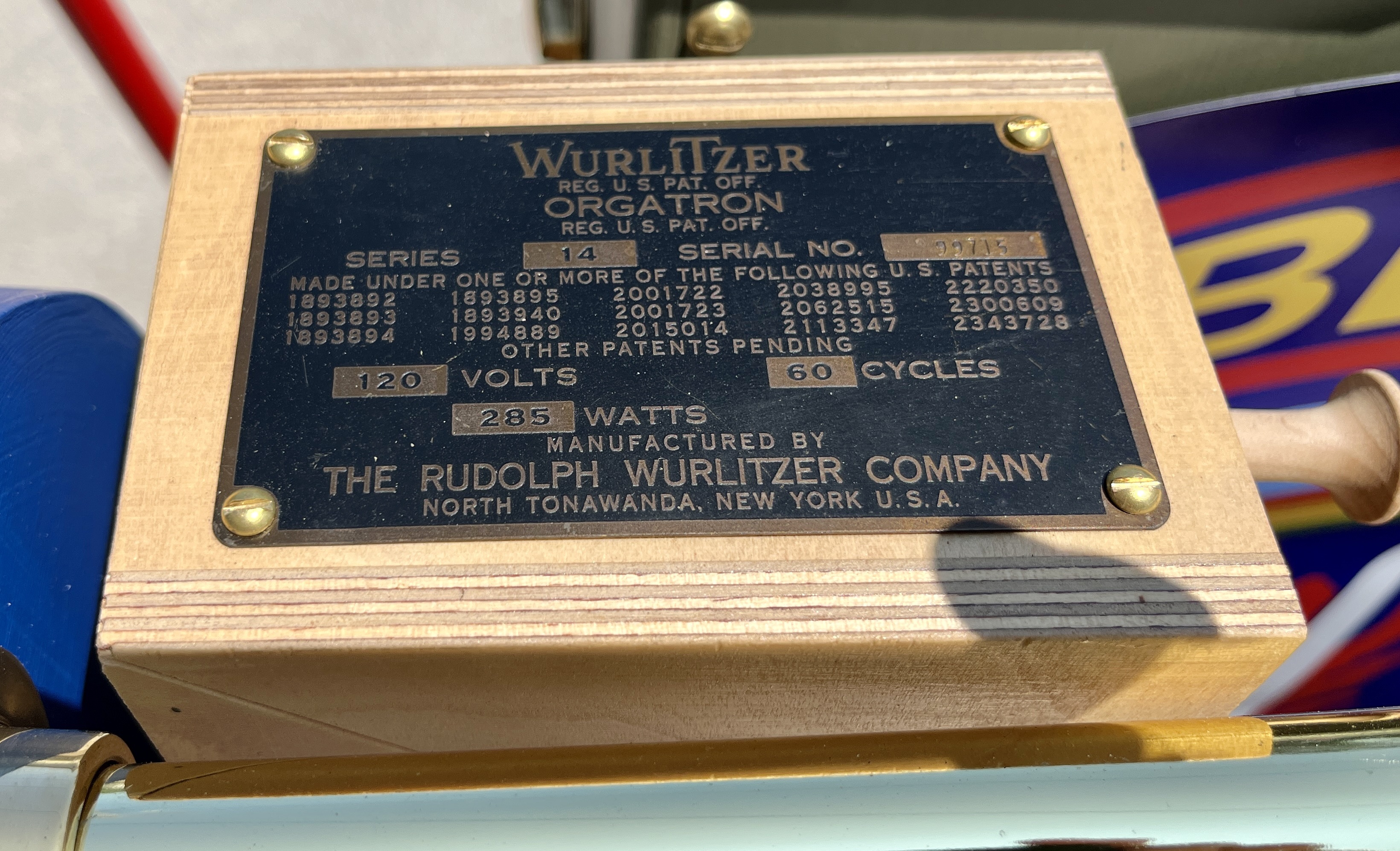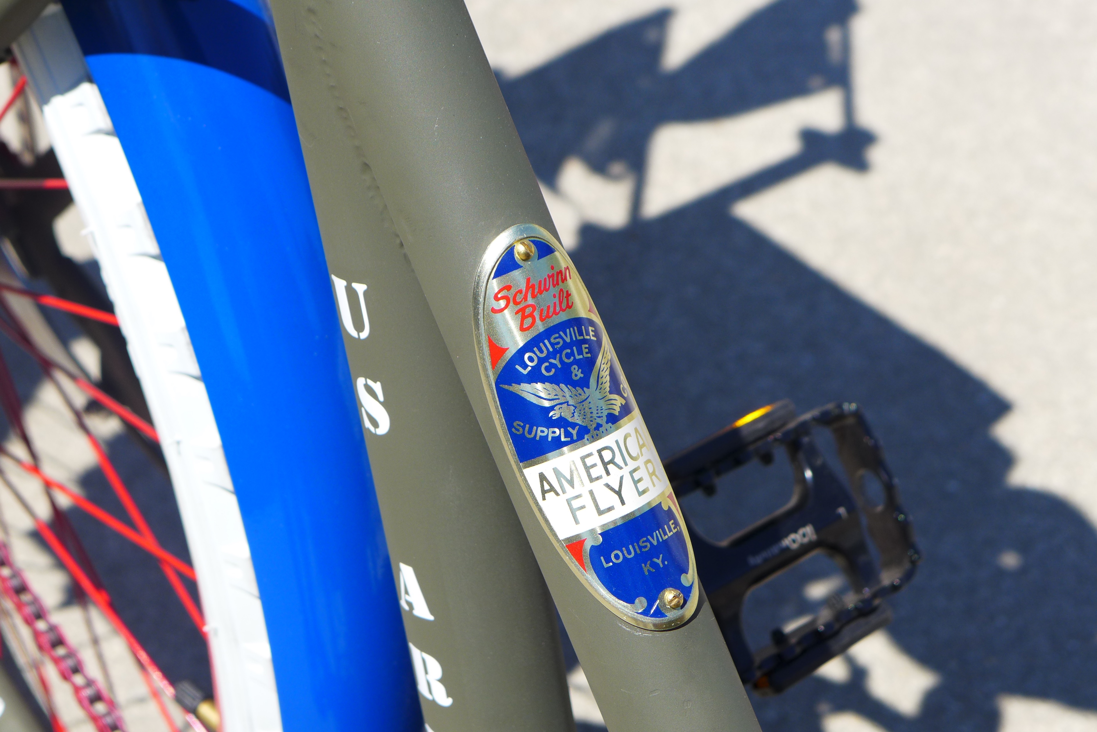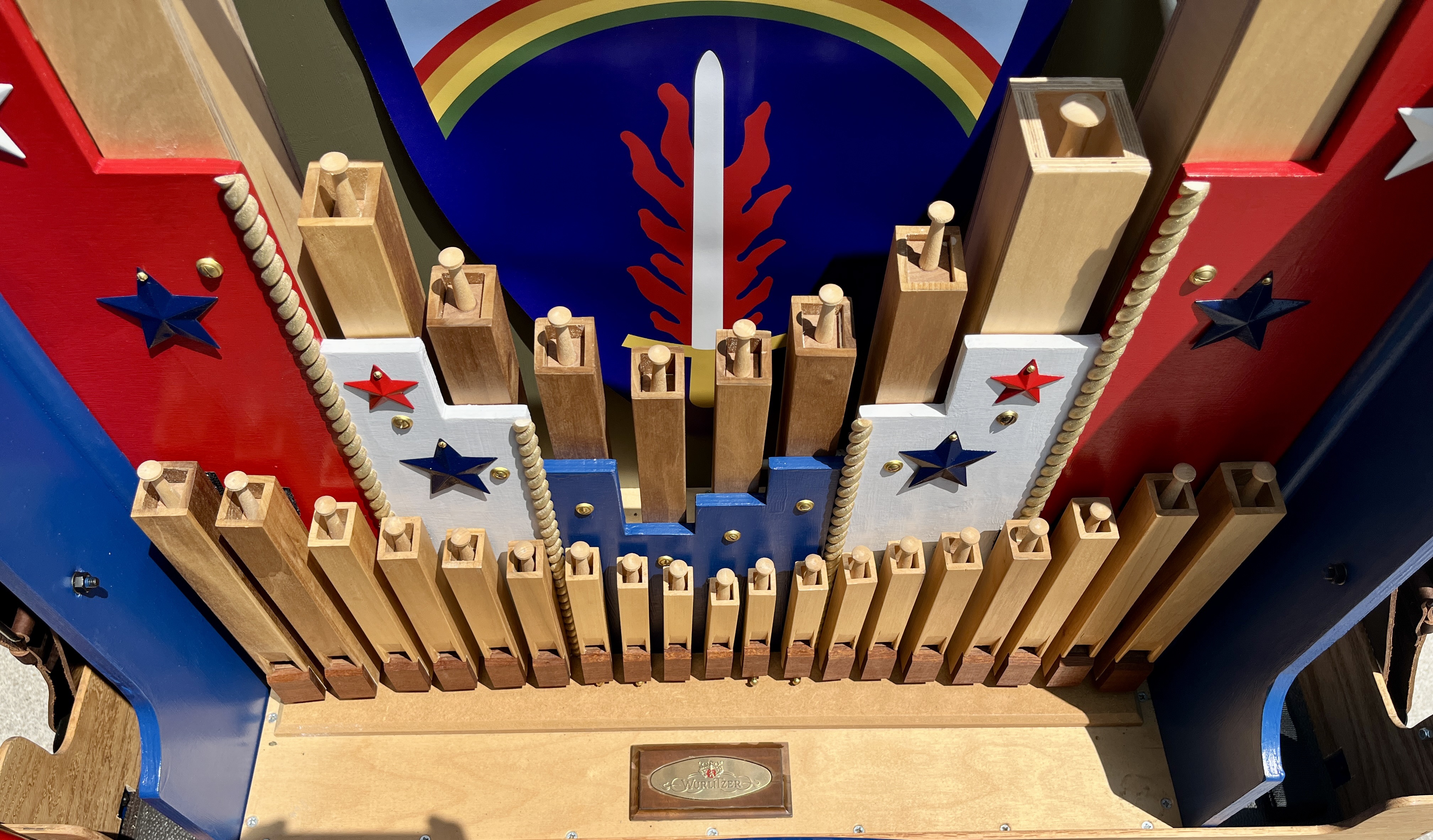 This Mobile Parade Unit (MPU) consists of a replica Schwinn Trike fitted with a replica Wurlitzer Parade Pipe Organ. The trike is Classic Americana custom painted red, white and blue. Trike is further outfitted with military parade regalia, military panniers, 4x period flags to include US Army, Berlin Bear Crest, USA, and Germany. The leather saddle with matching bag is Classic British Brooks. White tires are new Duros. The 3” leather tie down belts are also from England. The trike is single speed with a rear pedal brake and dual front parking brakes. Parade Pipe Organ is a replica Wurlitzer with 31 wood flutes. There are two sources for wind supply, a hand cranked bellows, and a 12v blower. Music controller is an updated MIDI player that uses SD card memory to hold MIDI files. Tunes can be played custom sequenced, as selected, or continuously looped. The organ scale is the standard 31-note as used in modern street organs.